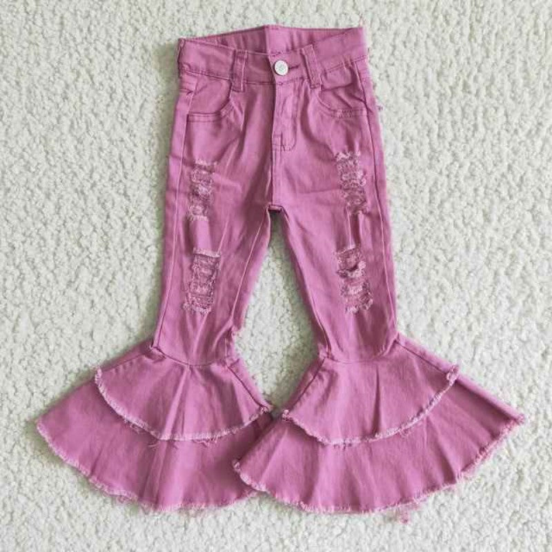 Fashion Denim Pants Kids Girls Double Ruffle Flare Bottom