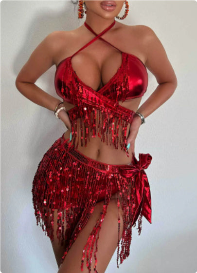 Fission Sexy Tassel Bikini Swimsuit Three-piece Female Cloth