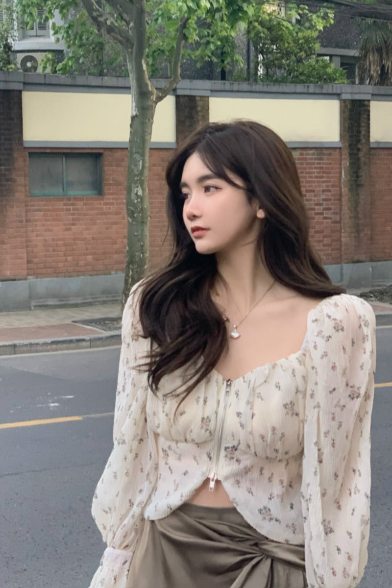 French Floral Chiffon Shirt Coat Women\'s Summer Thin Senior Design Small Short Shirt Long Sleeve Top