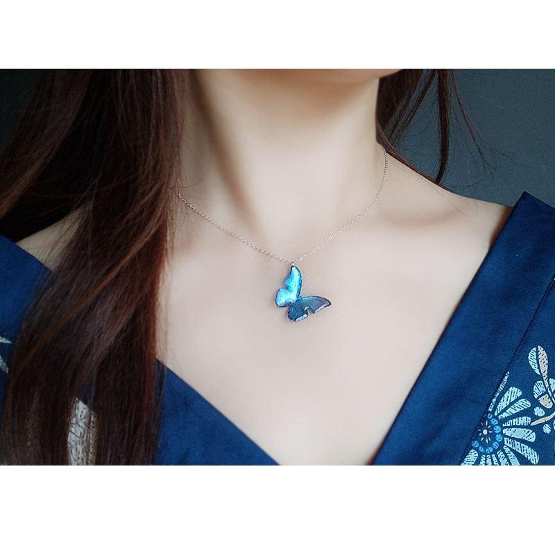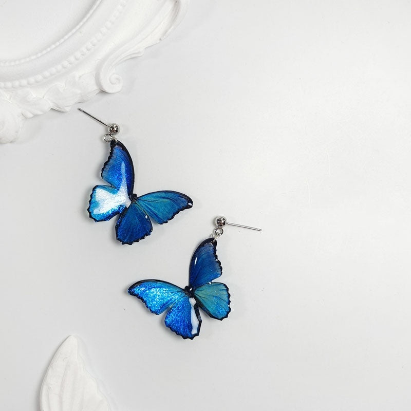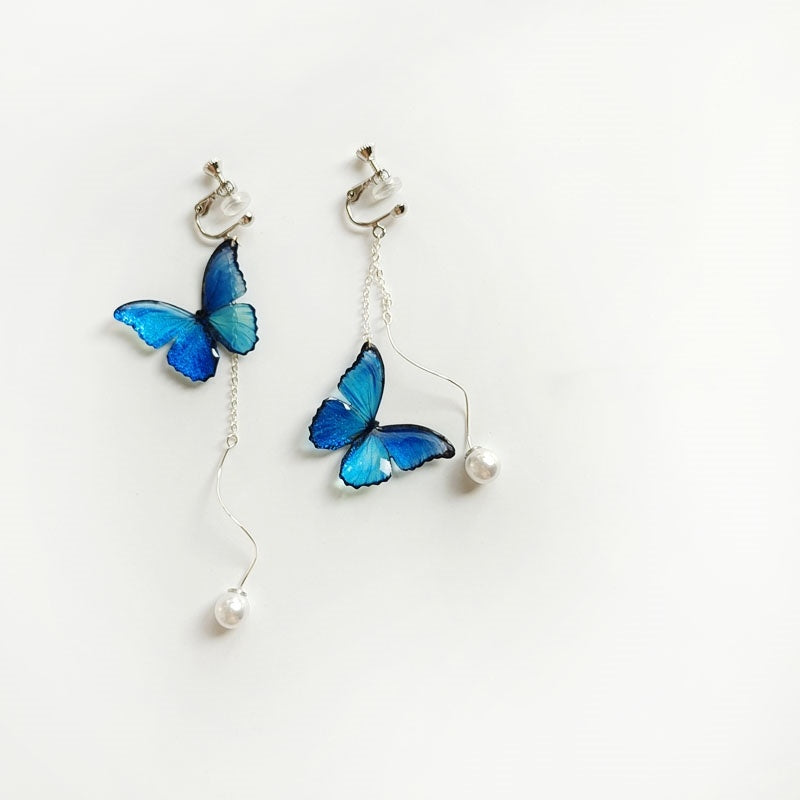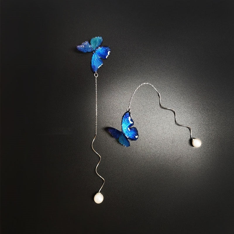Blue Butterfly Ear Thread S925 Sterling Silver Long Pearl