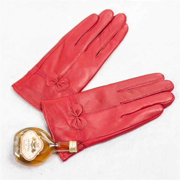 Autumn And Winter Sheep Leather Gloves Women Driving Cold Red Cute Bow Women Plus Velvet Warm Leather Gloves