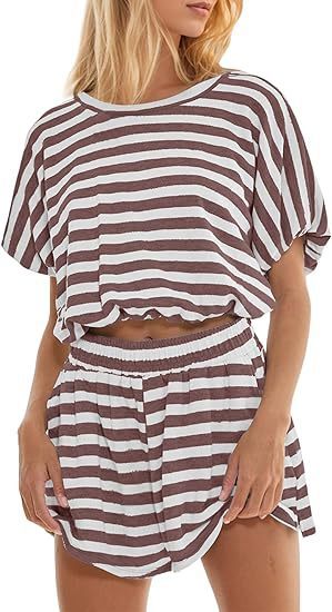Women's Short Sleeve Striped T-shirt Loose Midriff Outfit Shorts Casual Suit