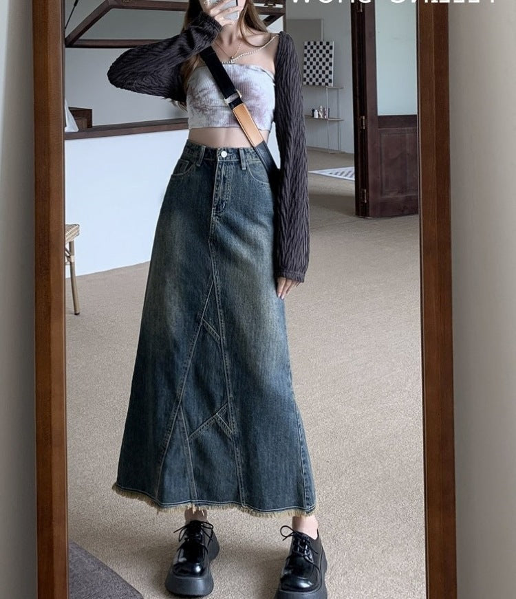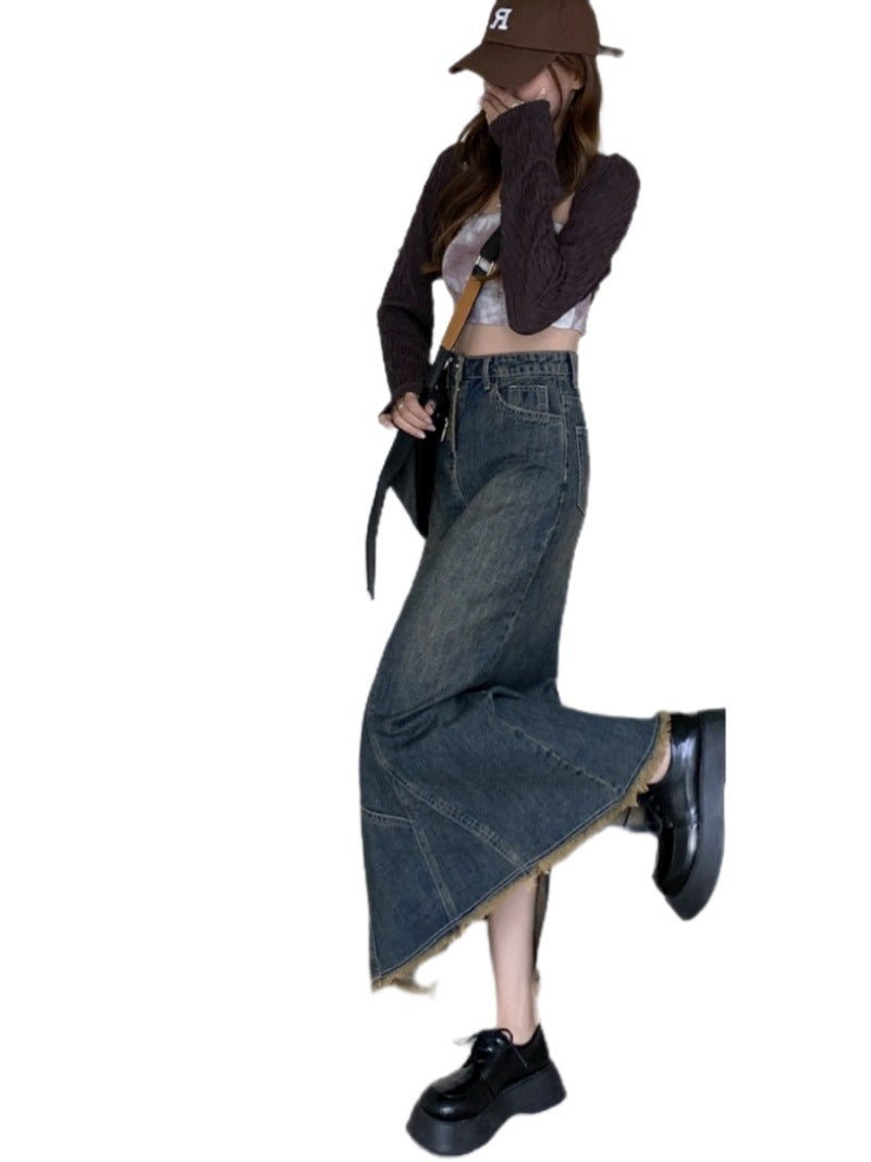 Retro Denim Skirt For Women Summer High Waist Back Slit Medium Long Slim A-line Skirt