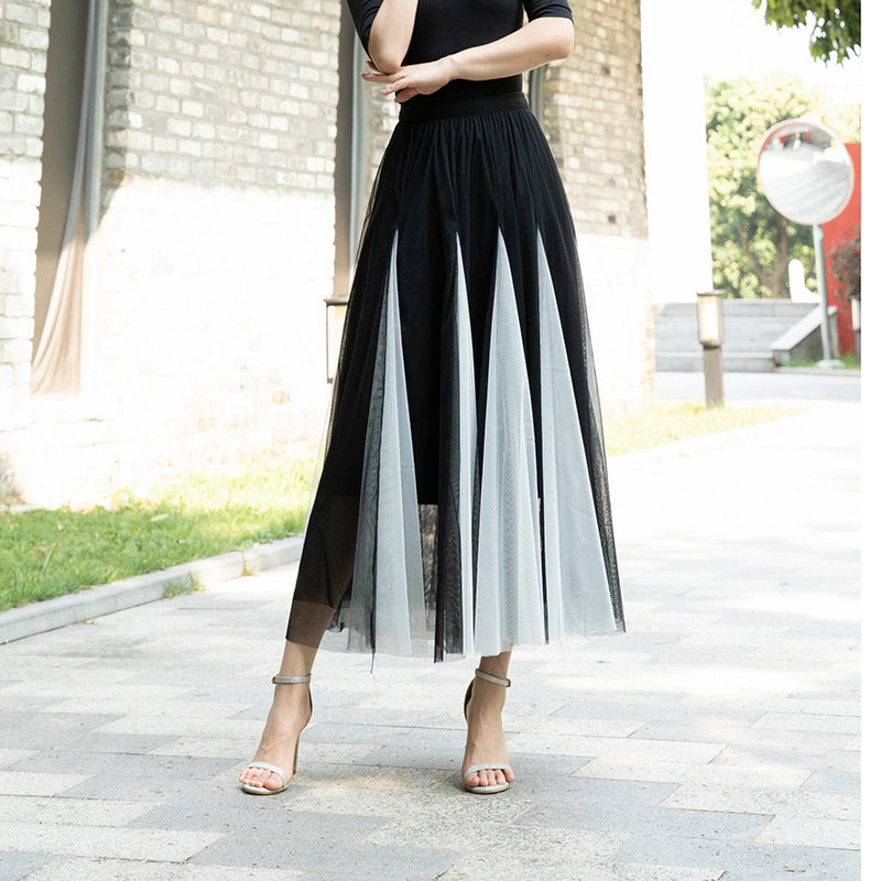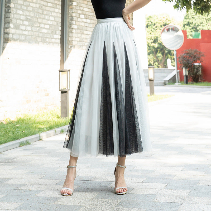 Professional Solid Color Multi-Layer Lace Tiered Skirt - Polyester High-Waisted (Black/White, M-L, College Style)