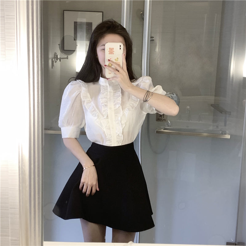 Shirt Women\'s Short Ruffle Design Minority White Short Sleeve Shirt Summer French Thin Bubble Sleeve Top