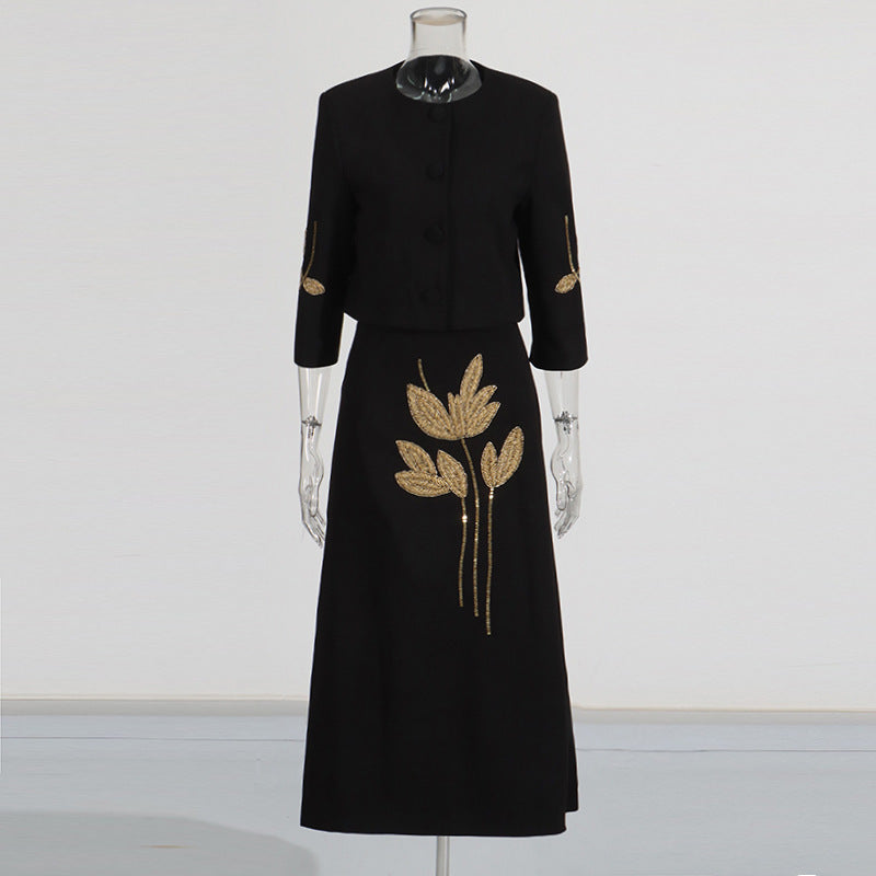 Exquisite Flowers Beaded Top High Waist Skirt Two-piece Set
