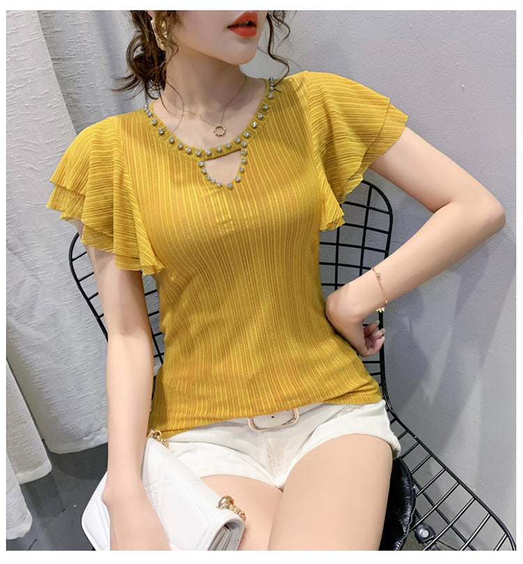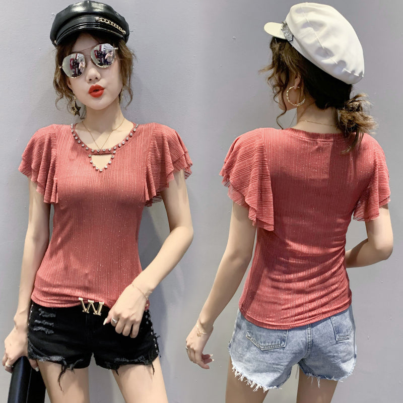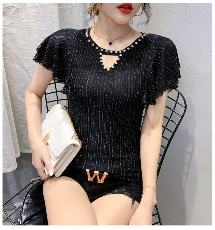 2021 New Mode Kort ärm T-shirt avec une ligne et des diamants et des kvinnors flygande ärm topp