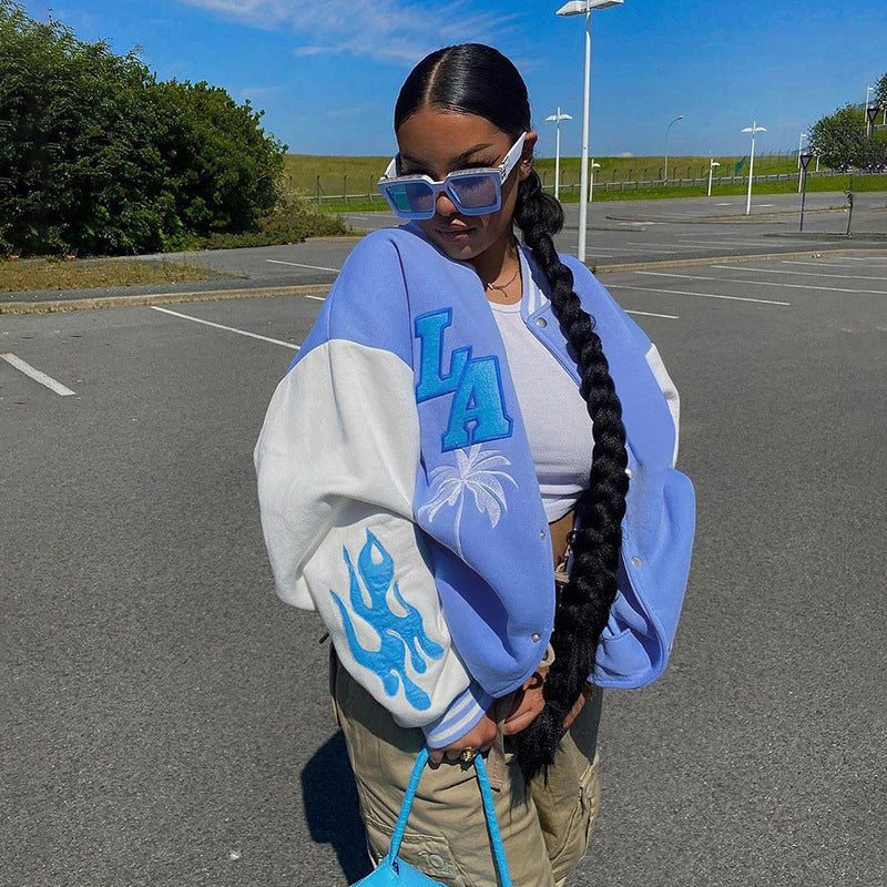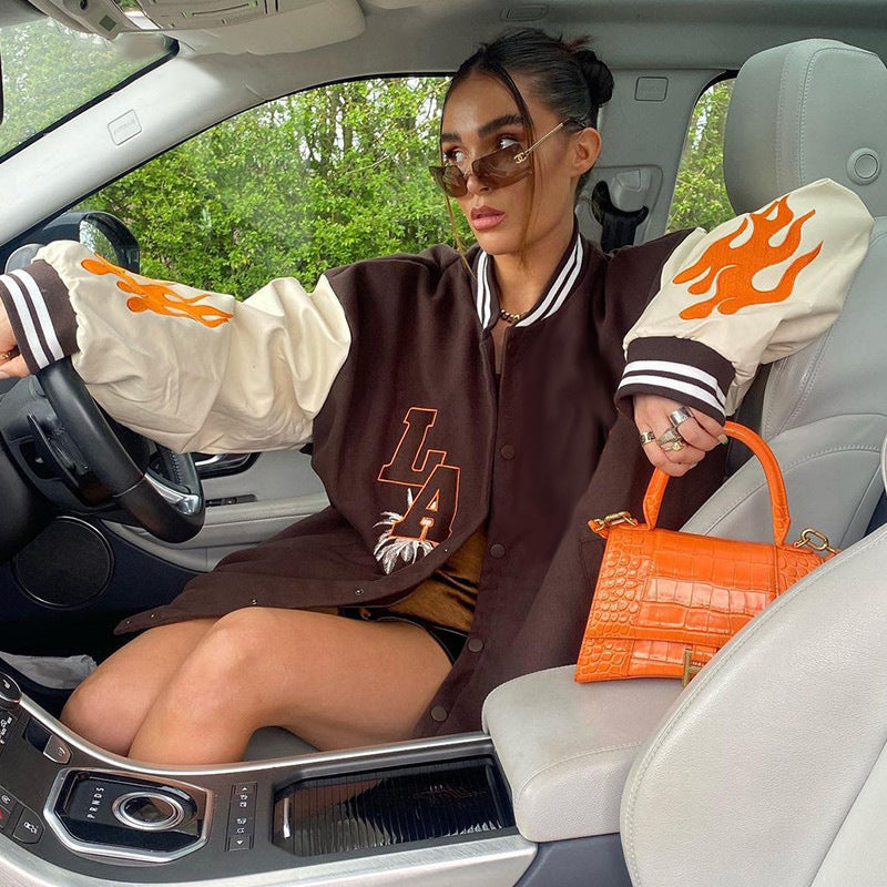 Contrast Stitching Embroidery Loose Casual Baseball Uniform Jacket - Vibrant Statement Intricate Comfortable