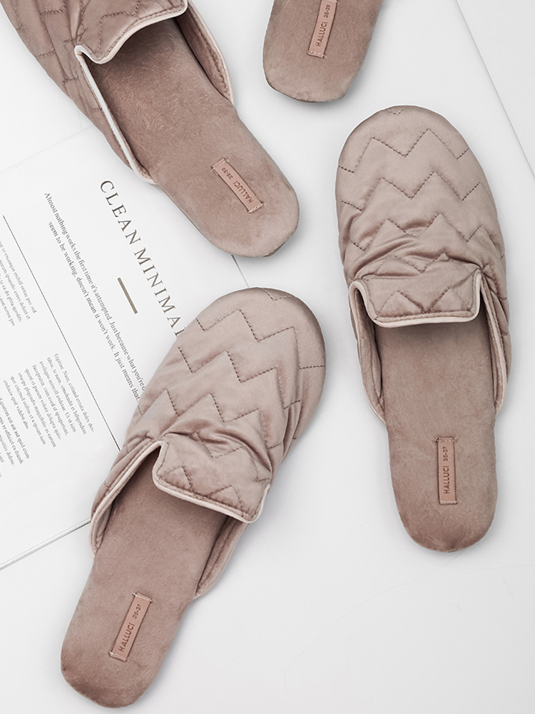 Färgklassificering: rosa sammetsbroderitofflor, champagnetofflor med tofsboll