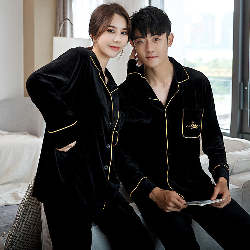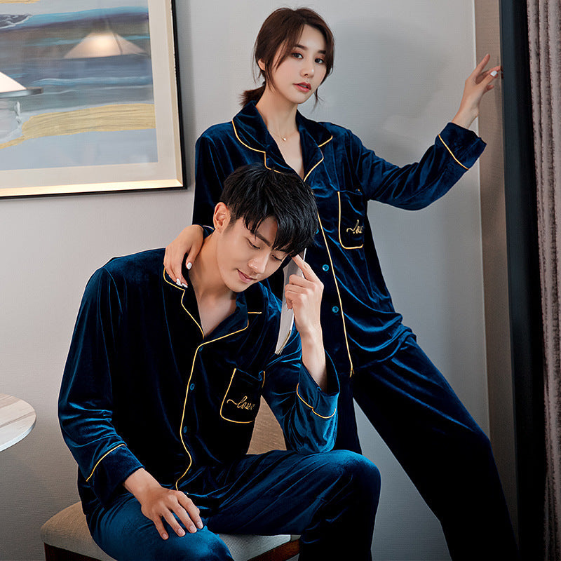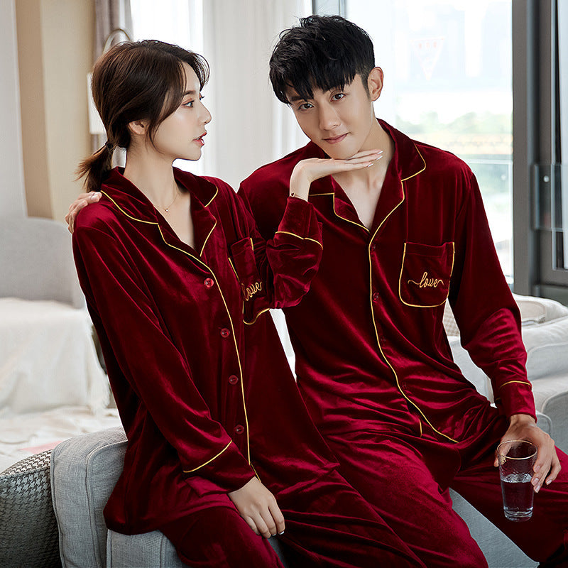 Parpyjamas Dam Vår- och höstpyjamas Herr Långärmad Rödguld Sammet Hemmakläder