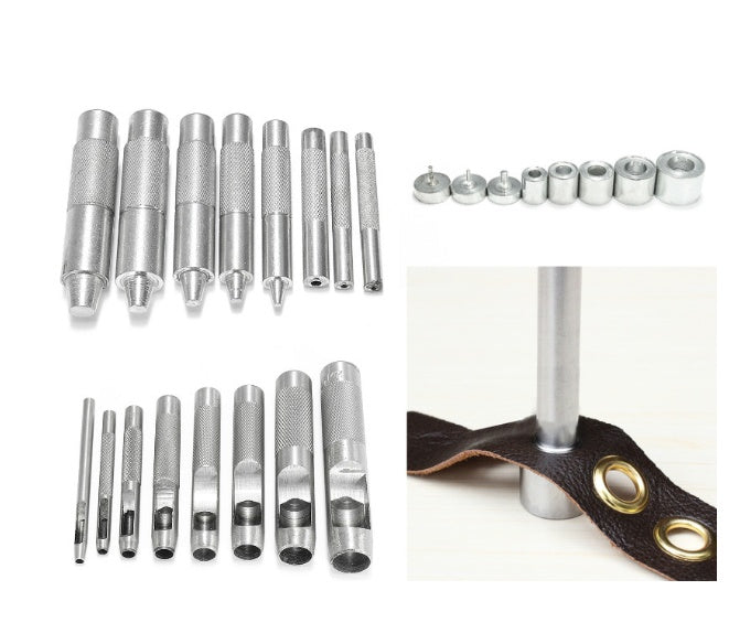 - Set med stans och hålslag, levereras med 10 uppsättningar silver- och 10 uppsättningar mässingsöljetter, lätt att använda och hantera.