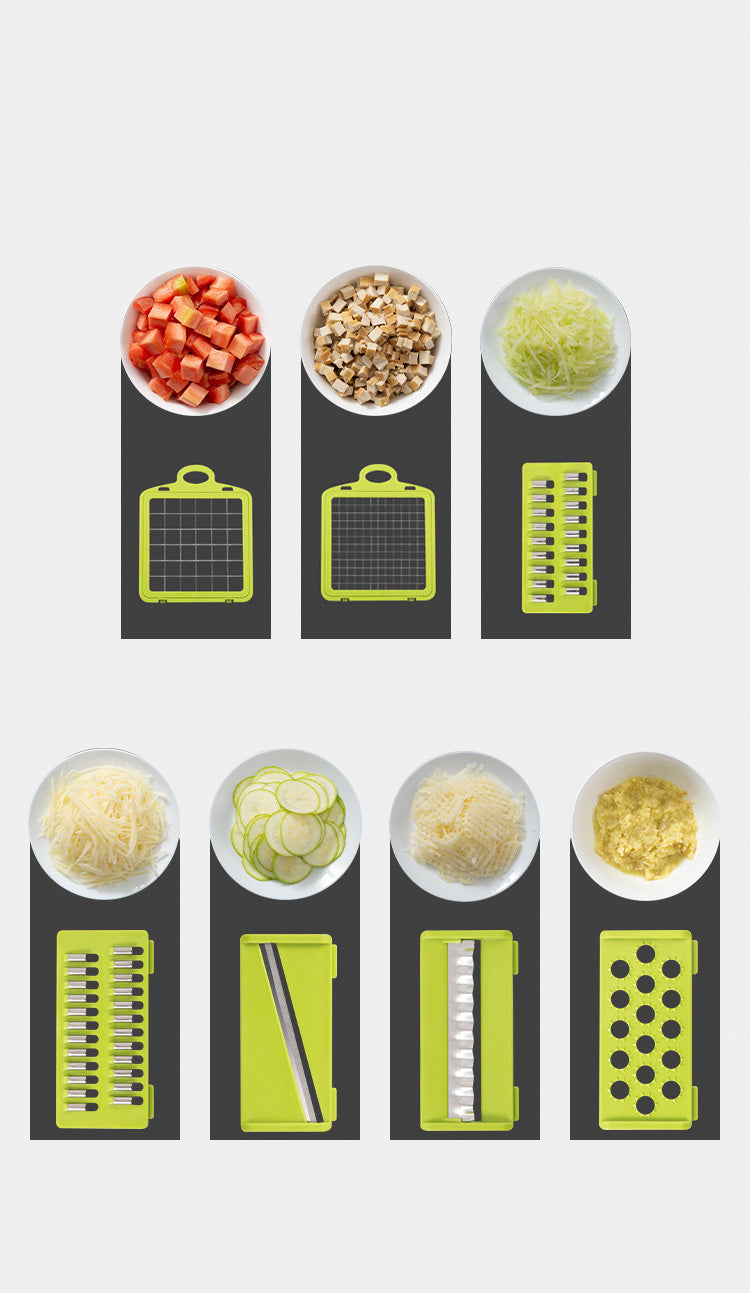 Produktset: grönsaksskärkropp + 7 knivar + handskydd + rengöringsborste + bladlåda + förvaringslåda vattenfilterkorg